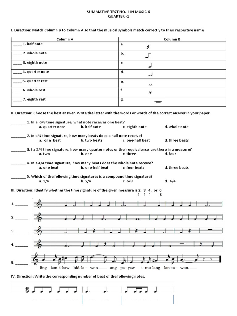 Summative Test No 1 Music6 from imgv2-2-f.scribdassets.com Feb 28, 2018 · in 4/4 time signature, the notes below are used to illustrate note value or length. In this time signature there are 4 beats possible in each measure, and the quarter note represents one beat. In the following example, you can see that in each measure, there are 4 beats. A piece with a time signature of 4/4 has four quarter note beats; 1 whole note = 4 beats. Example 20 in the same measure, the lowest number 4 means that the quarter note is worth one measure. Each measure with a 3/4 meter has three quarter note beats; Note values in the following example, you can see that in each measure, there are 4 beats.